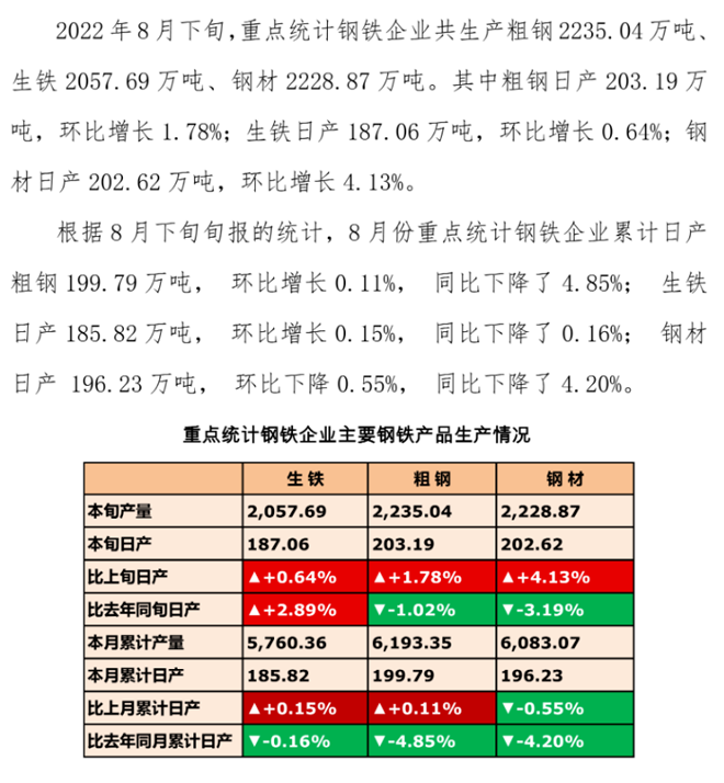 8月下旬重点统计钢企日产钢203.19万吨,环比增1.78%同比降1.02%