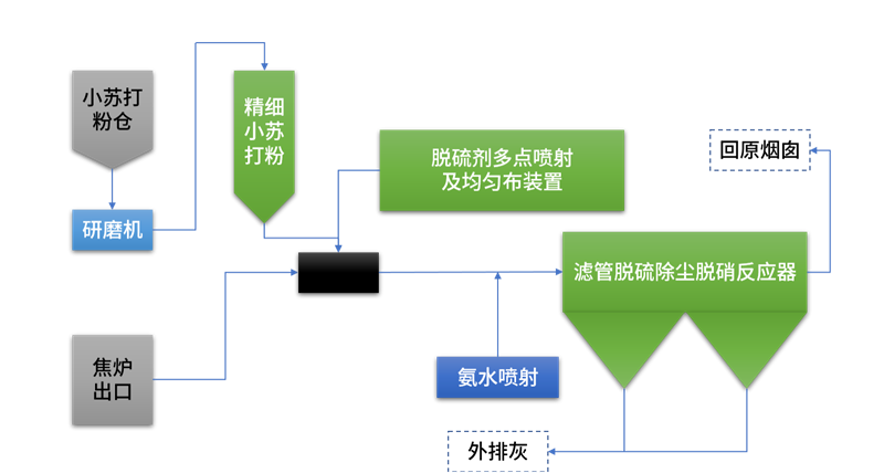 焦炉烟气经过地下烟道引出,在引出烟道处,通过磨粉机多路喷射+精确计量装置+均布装置定量喷入碳酸氢钠超细粉,烟道中均匀混合后进行一次脱硫反应,再经喷氨系统,将18%~20%浓度的氨水通过双流体雾化喷枪喷入滤管反应器入口烟道,通过导流板和气流分布板分布均流后进入陶瓷滤管装置,粒径较大的粉尘在重力作用下沉降,粒径小的粉尘沉积在滤料表面形成尘饼层,并在陶瓷管表面的尘饼层上进行二次脱硫,无尘硫气体通过滤料表面再与滤管壁内的催化剂层接触发生反应氮氧化物被一次脱除,清洁烟气再通过引风机烟囱排出。