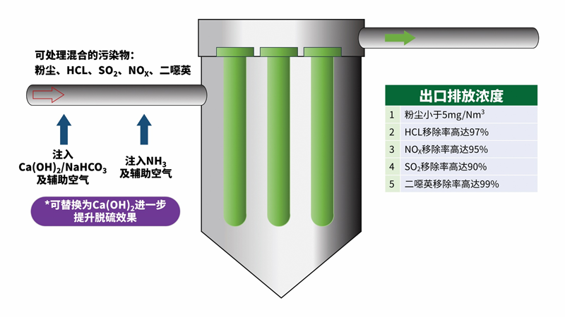 (1)前端干法脱硫和陶瓷虑管尘饼层辅助脱硫结合(相当于管道混合脱硫和陶瓷管尘饼层两次干法脱硫),脱硫效率高;搭配添加相应的添加剂,可以有效地去除SO2、HCl、H2S、HF等酸性气体;兼容各种干法/半干法脱硫工艺,减少了烟气中煤焦油、焦炭、粉尘以及粉尘中重金属离子对脱硝催化剂的影响,增加了催化剂的使用寿命。