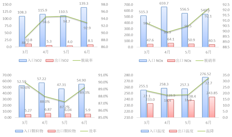 陶瓷催化虑管一体化脱硫脱硝技术已经在涟钢成功运行,各项性能指标均满足焦炉烟道气超低排放要求。投运至今,已经安全平稳运行超4个月,出口烟气SO2含量平均在10mg/m³左右,脱硫率在92.7%左右;出口烟气NOx平均在50.8mg/m³,脱硝率在90.8%左右;出口烟气颗粒物平均在6.02mg/m³,除尘效率平均在89%左右。企业实现了焦炉烟道气超低排放目标,具有良好的环境效益,履行了企业的社会责任。