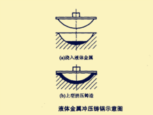 液体金属冲压又称液态模锻。实质上,它是另一种类型的挤压铸造,所不同的是液体金属冲压的过程与一般冲压过程相似,即在压力机的砧座上安装一类似冲模的下型,向此型中浇入液体金属如右图(a)所示。而后类似冲头的上型(也可称为冲头)往下移动,将下型中的液态金属挤满型腔,在压力作用下凝固成型,如右图(b)所示。