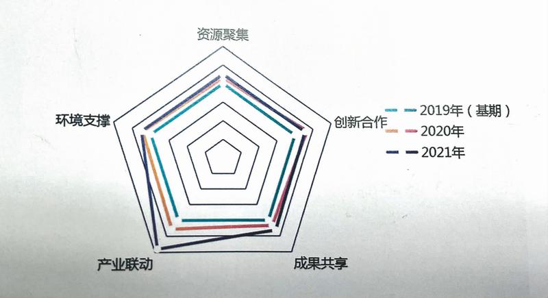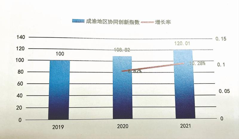 该报告以2019年为研究基期,从资源集聚、创新合作、成果共享、产业联动、环境支撑5项一级指标及17项二级指标,分析成渝地区协同创新指数发展情况。2022年度报告显示,从2019年到2021年成渝地区协同创新水平稳步提升,2021年协同创新总指数较2019年增长20.01%。其中,产业联动指标增幅最大,较2019年增长44.88%;其次是成果共享指标增长15.77%,创新合作指标增长14.25%。报告还显示,近年成渝地区协同创新呈现不少亮点:R&D经费支出快速增长,2016~2021年增长110.5%,高于全国平均增速32.2个百分点;R&D投入强度再创高点,2016~2021年提高0.49个百分点,高出全国平均增幅0.15个百分点;高校院所研发投入增长强劲,2016~2021年增长113.2%;环境支撑持续增强,交通基础设施完善优化,2016~2021年成渝地区高速公路和铁路密度增速为23.9%,高于全国平均增速12个百分点。