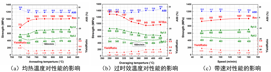 以1.0mm厚的CR550/980QP冷硬板为例,采用Gleeble3500模拟均热温度、过时效温度以及带速对性能的影响规律(图4)。基于产品力学性能要求及产线控制水平,确定了1.0mm厚度带钢均热温度最佳值为800℃,过时效温度最佳值为340℃,带速最佳值为150m/min。通过可重复性试验,形成了不同厚度Q&P钢的连退工艺制度,成功开发出了基于常规连退产线的Q&P产品。