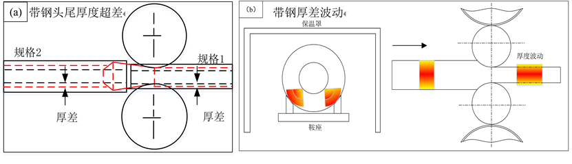 超高强钢带头带尾轧制过程厚度波动大(图5),而反馈控制系统的厚度波动控制具有滞后性。项目基于金属秒流量模型建立厚度超差预测模型,以实现对轧机出口厚度超差的预测与防治。