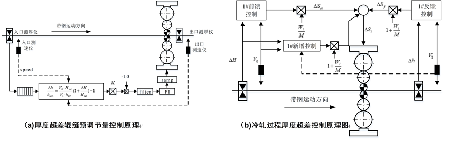 辊缝调节量预估模型:结合冷连轧机组现有前馈与反馈控制模型,建立冷连轧机组超高强钢轧制过程中的辊缝调节量预估模型,控制原理见图6(b)。