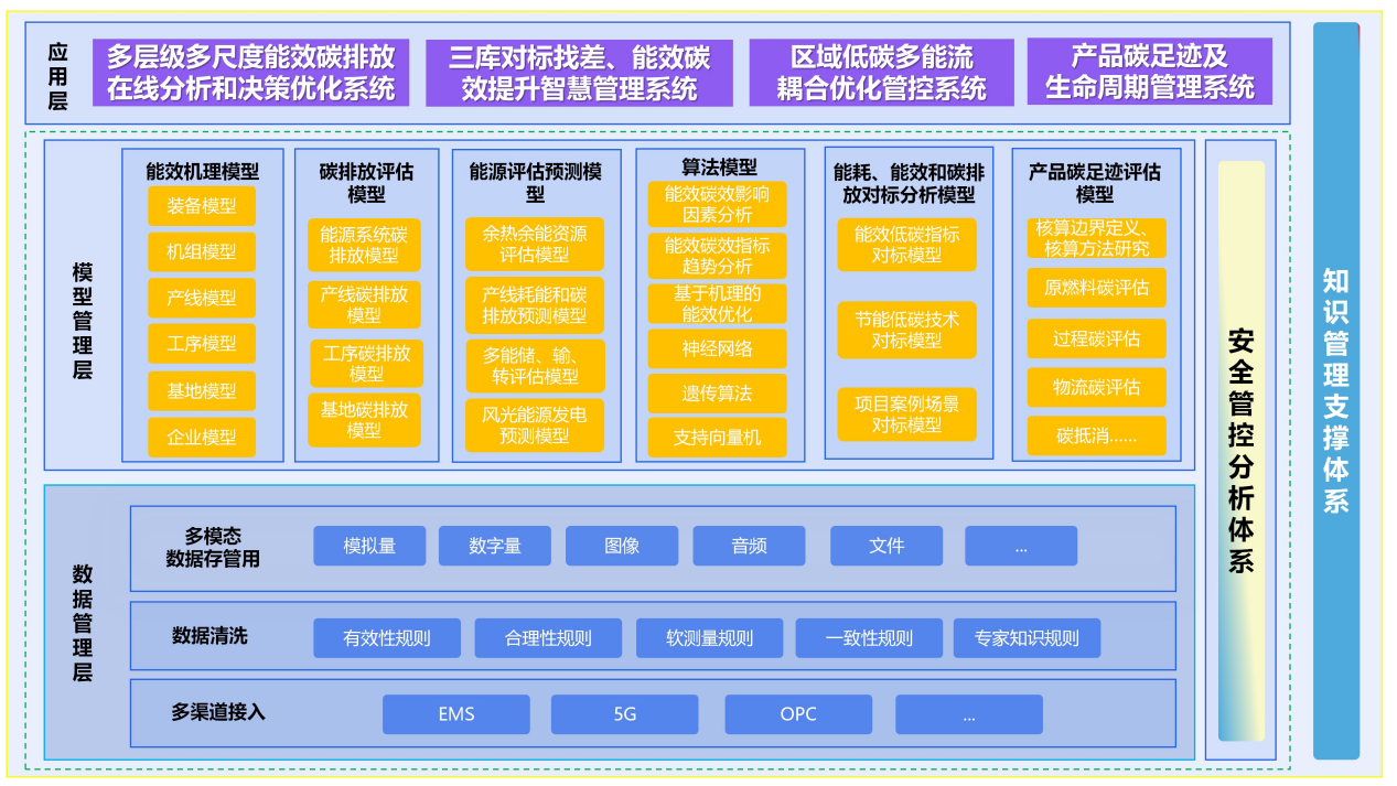 图1中技术体系架构主体分为三层。底层为数据管理层,实现多渠道、多模态数据接入管理,基于规则的数据清洗,以及多类型数据一站式存管用。中间层为模型层,包括各种机理模型、数据驱动模型、优化模型、评估模型、预测模型、对标模型等。最上层为应用服务层,系统用户可通过人机交互进行服务定制,系统将根据需求提供定制化服务。模型层中的模型按应用服务层发出的请求,加工处理来自数据管理层的数据,提供所需求的定制服务。平台系统也提供知识管理及支撑体系和安全管控分析体系,增强平台系统决策支持功能,保障平台系统安全稳定,从而形成便捷、灵活、智慧、安全的能碳精益化管控解决方案。