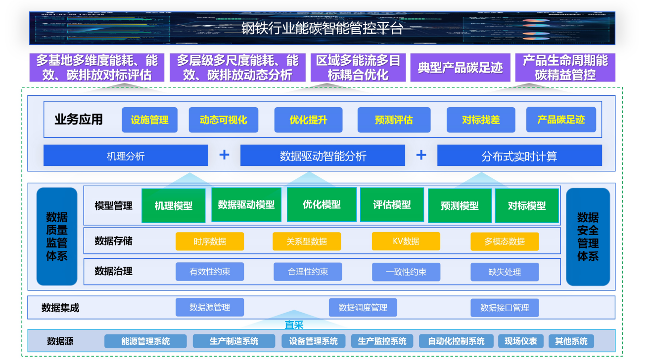 面对钢铁工业绿色低碳和节能减排智慧管控需求,突破能耗、能效和碳排放可视化建模与仿真、多尺度能效动态评估、碳排放量化方法、多基地能耗和碳排放对标评估方法等技术,开发能碳智能管控平台,建立装备-产线-工序(车间)-基地(工厂)等多层级能耗、能效和碳排放模型,建立区域多能流平衡调度、多主体协同优化模型和全生命周期碳排放模型,实现能碳信息综合监控、能效分析优化和碳足迹全生命周期计量与追溯,降低能耗和碳排放量,助力行业尽早达到能效标杆水平,实现碳中和。