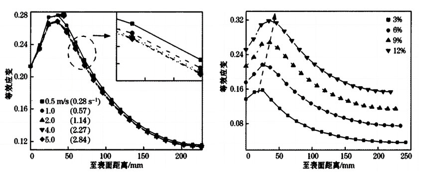 图1 不同轧制速率和不同压下量下钢板的变形应变