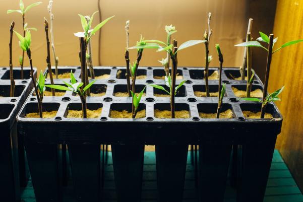 在生产实践中,人们利用植物的再生能力发明出了嫁接、压条、扦插和组织培养等技艺。嫁接指将一种植物的枝条或芽(接穗)嫁接到另一种植物的茎或根(砧木)上,能够整合不同植物的优良性状(图4)。将植物的茎、叶、根或芽的一部分插入适宜的基质(如土壤、沙子、水等)中即可生根发芽,最终发育成新的植株的方法就是扦插。扦插也因此分为茎插、叶插、根插等,如月季、杨树茎插,多肉植物常见的叶插等(图5)。通过组织培养,技术人员能够利用兰花的茎尖、叶片等组织进行繁殖,大规模生产出品质优良、外观一致的兰花植株来满足市场需求;将马铃薯无病毒的茎尖组织进行培养,能够繁育出健康的无毒植株,提高马铃薯的质量和产量(图6)。