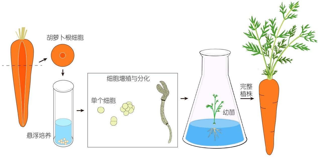 直到1958年,Steward等人将胡萝卜根韧皮部的细胞进行离体培养,发现这些细胞先后经历了脱分化和再分化过程,最终形成胚胎并发育成具有根、茎、叶等器官的完整植株(图7),证实了植物细胞的全能性假说。