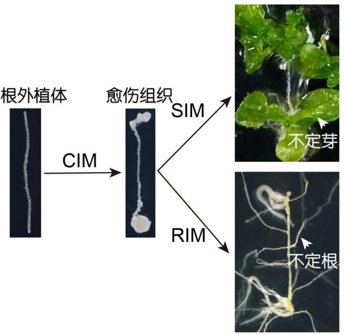 图10 拟南芥的间接离体再生体系(CIM,愈伤诱导培养基;SIM,芽诱导培养基;RIM,根诱导培养基)