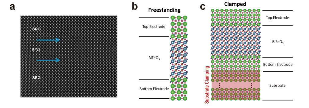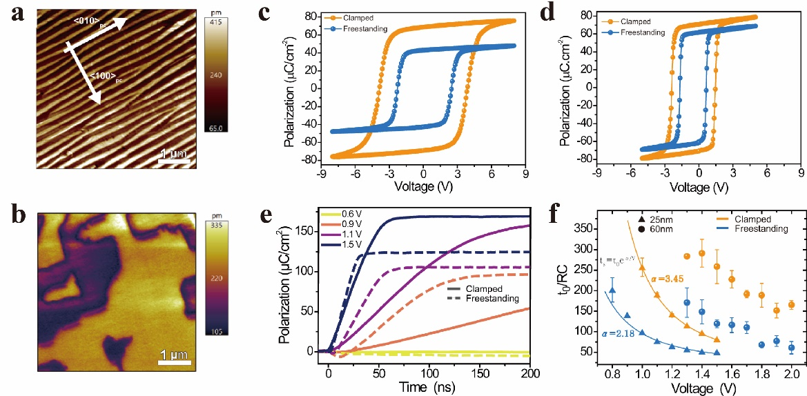 该研究基于脉冲激光沉积系统设计制备BFO/锶钌氧(SRO)/镧锶锰氧(LSMO)/钛酸锶(STO)高质量外延薄膜,将LSMO层刻蚀掉后,通过lift-off工艺将薄膜从STO衬底剥离、实现freestanding状态,随后转移至Pt/Si衬底(图1);在此过程中,BFO仍保持良好外延特征,但是发生轻微晶格畸变,c值减小、a值增大,表现出无衬底束缚后的relaxed特性。结合PFM测试和相场模拟发现,去除衬底束缚后,BFO中发生铁弹畴消失和铁电畴长大(图2a、b),可以由此减小BFO铁电极化翻转过程中畴长大遇到的阻力。进一步通过超快铁电极化特性测试分析,证实freestanding可以大幅降低BFO的铁电极化开关电压约40%(图2c、d),并可提高极化开关速度约60%(图2e、f)。研究成果为进一步实现超低功耗铁电(多铁)器件提供了普适性的试验和理论依据。