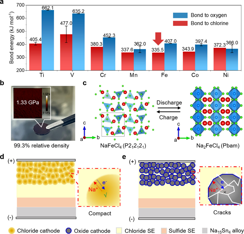 研究人员发现,Fe-Cl键在所有过渡金属-氯双原子分子中具有最低的键解离能(335.5 kJ mol-1),这意味着选择Fe作为氧化还原活性元素更有可能构筑高可变形性正极。在此基础上,研究人员成功合成了NaFeCl4,并发现冷压成型的NaFeCl4杨氏模量仅为1.33 GPa,并具有极高的致密度(99.3%, 375 MP),有利于固态电池复合正极内部良好的固固接触。