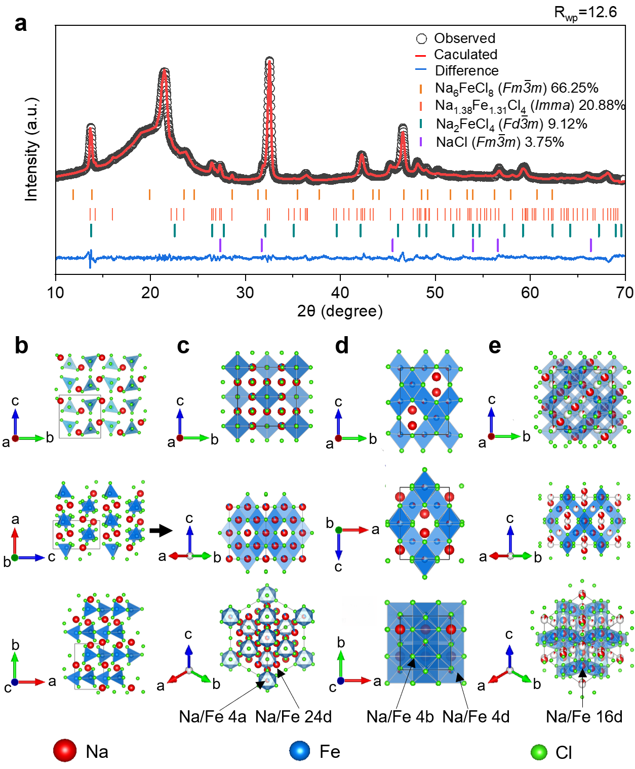 图2.完全放电产物Na2FeCl4晶体结构的解析。