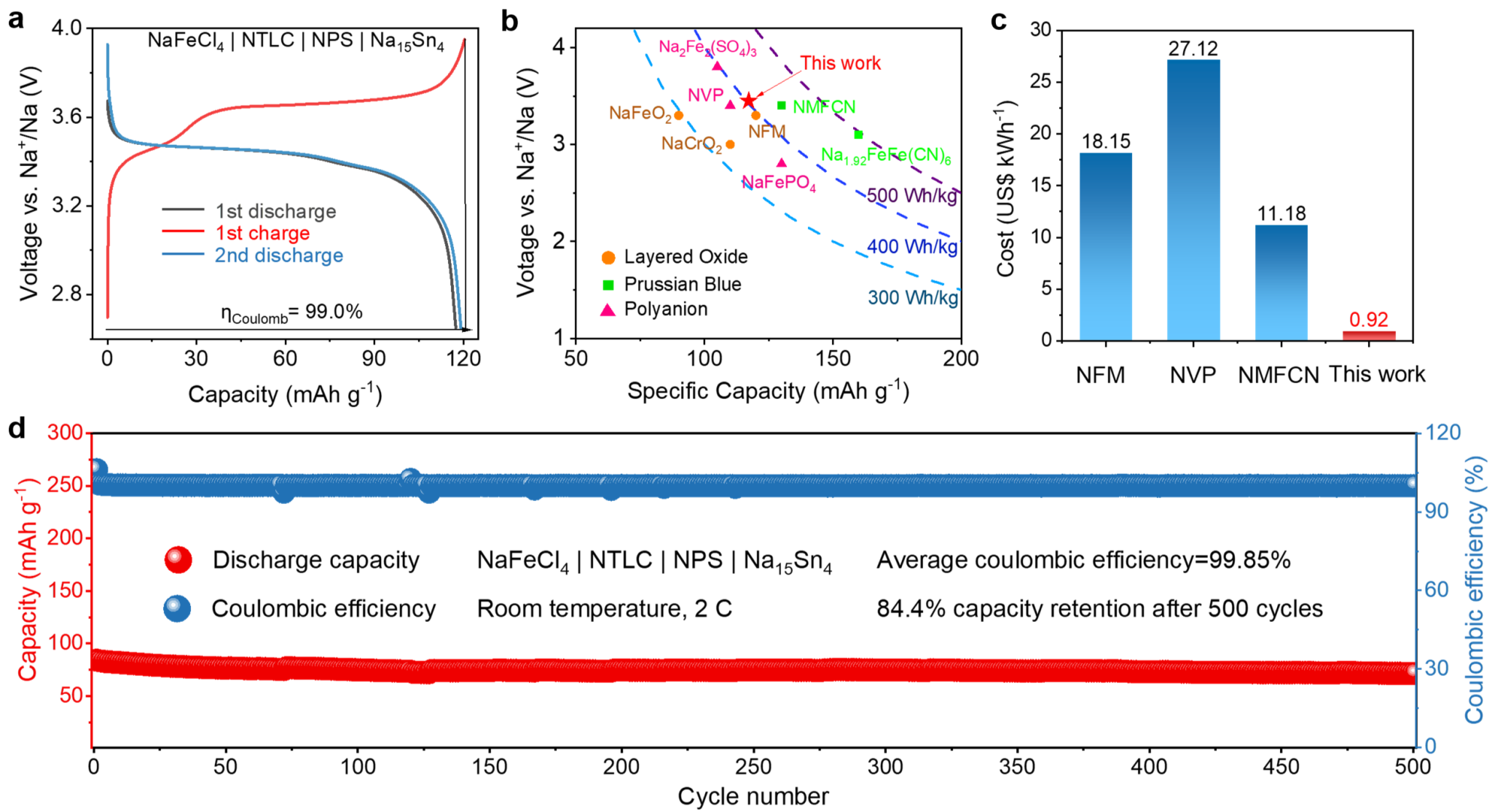 得益于NaFeCl4的可变形性和结构可逆性,基于其组装的全固态钠电池在500次循环后仍能维持84.4%的容量保持率。令人欣喜的是,尽管成本仅为常用钠离子电池正极NaNi1/3Fe1/3Mn1/3O2的5.2%和Na3V2(PO4)3的3.7%,NaFeCl4仍能提供具有竞争力的能量密度(~405 Wh kg-1),这表明该新型钠电氯化物正极不仅为解决全固态复合正极的接触失效问题提供了全新的材料策略,还在未来大规模低成本储能方面具有巨大的应用潜力。