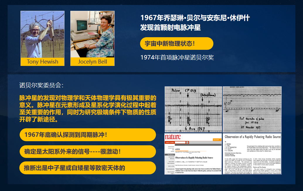 1967-1968 年,英国 Hewish 教授及其学生通过无线电波阵发现了脉冲信号。这个波动跟地球上汽车开过去的干扰信号非常相似,但是 Hewish 教授的学生通过仔细观察,发现了其中的细微区别,后来,他们发现这个信号会每天提前 4 分钟到达——这是来自天上的信号和来自地球的信号的区别,最终确认它来自中子星,就是现在大家说的脉冲星。Hewish 教授也因此获得诺贝尔奖。