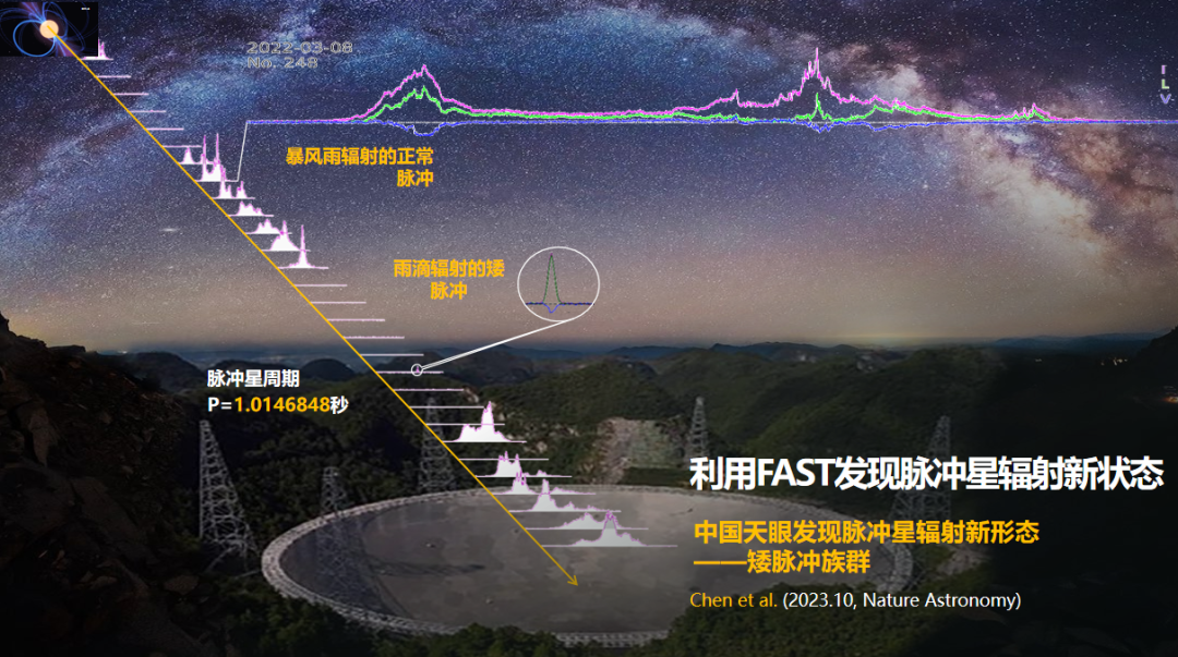 除了发现新脉冲星,FAST 在脉冲星辐射难题的研究中也做出了重要贡献。过去认为部分脉冲星会“停止辐射脉冲”,但 FAST 观测发现,这些“停止辐射”的阶段仍存在极微弱的“矮脉冲”,这类矮脉冲,时间很短、强度很低,一般的望远镜很难观测得很清楚。 FAST 已发现多个脉冲星有类似的辐射,为已经脉冲星辐射的物理过程提供了重要基础。