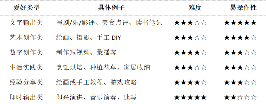 上面这些看起来并不那么复杂的小“切片”,其实也都是被网友们推崇的输出型爱好。它的核心不在于完成了多么大的工程,产出了多么复杂的作品,而关键在于“创造”和“外化”。我们可以把常见的“输出型爱好”,按照难度和可操作性大致做个划分: