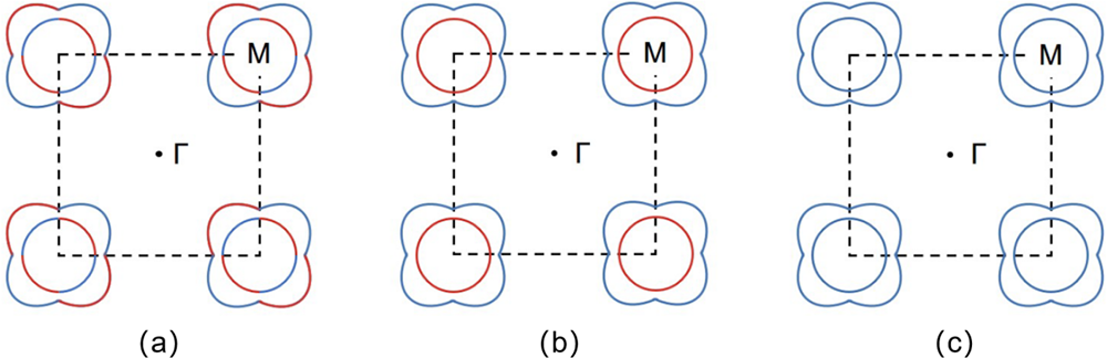 图1:在考虑自旋轨道耦合的情况下,单层FeSe/STiO3的费米面及其可能的超导配对对称性。其中,(a)对应d波对称性(该态只有在超导序参量远大于体系自旋轨道耦合强度时,其超导能隙才是无节点的),(b)对应\(s_{\pm}^{*}\)波对称性,(c)为普通的s波对称性。图中蓝色和红色表示费米面上超导序参量的符号不同。