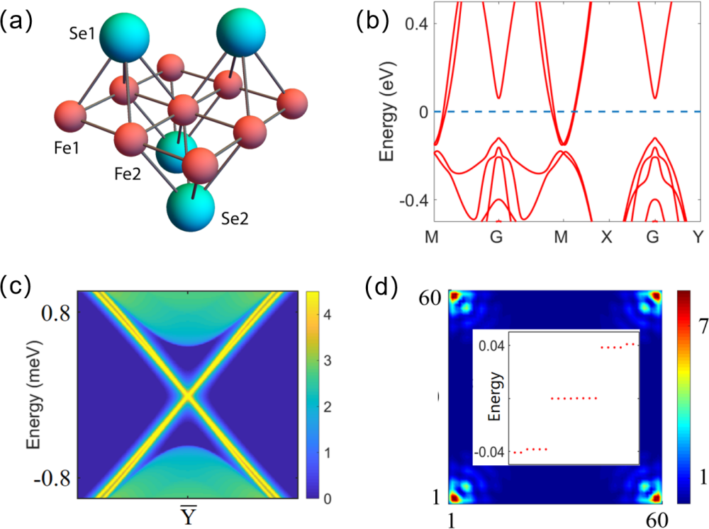图2:(a)为单层FeSe的晶格结构示意图,(b)为考虑自旋轨道耦合时单层FeSe的电子结构。当单层FeSe配对对称性为\(s_{\pm}^{*}\)波时,在由最近邻Fe-Se-Fe构成的边界上存在两个Dirac锥,如(c)所示;在由最近邻Fe-Fe形成的直角处存在一对Majorana零能模,如(d)所示。