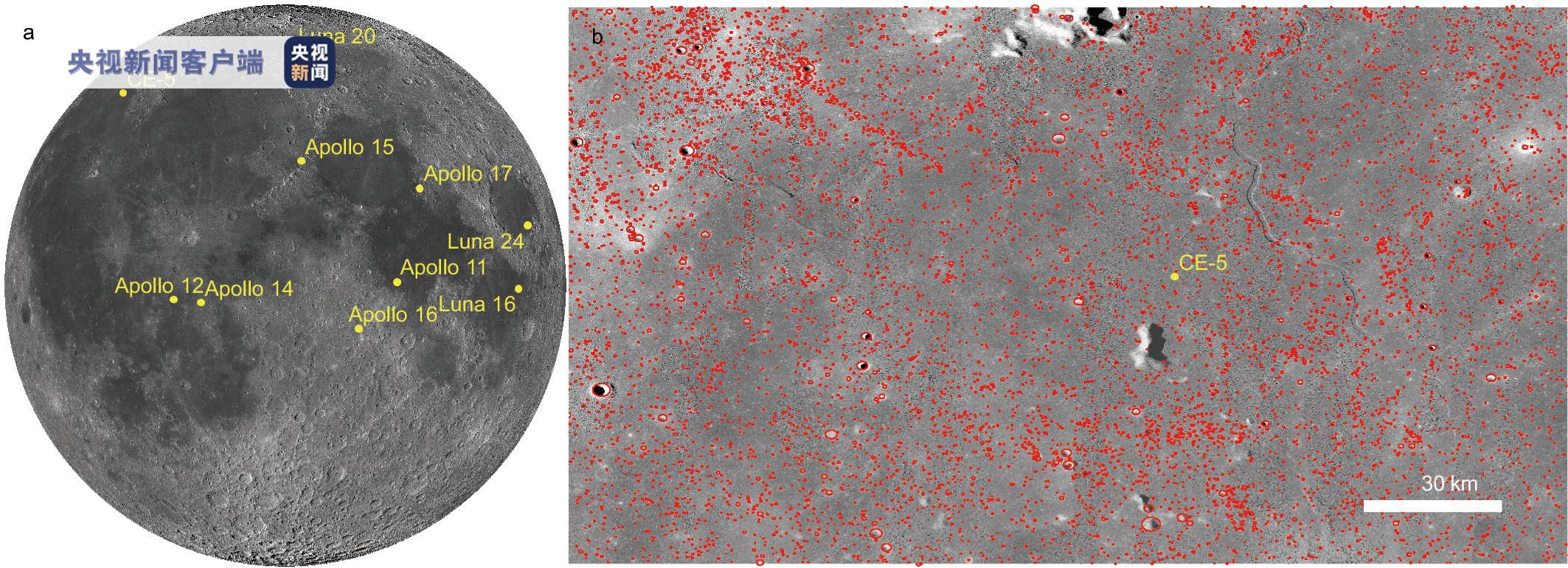 △月球着陆采样区域(a)和嫦娥五号着陆区撞击坑统计(b)