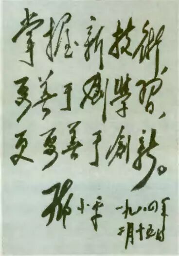 邓小平同志于1984年2月15日视察宝钢,在黎明等同志陪同下兴致盎然地驱车巡视了宝钢纵横13平方公里的厂区。视察后,邓小平欣然提笔,为宝钢题词"掌握新技术,要善于学习,更要善于创新。"邓小平的临别赠言,成了宝钢建设者的座右铭,勉励着宝钢人为赶上世界先进国家的钢铁工业去学习、探索和创新。